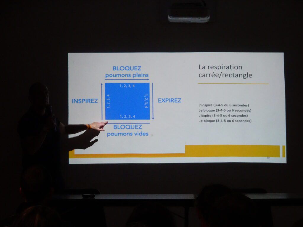 S’appuyant sur un diaporama très documenté, Jérôme Bruyas développait son exposé de manière vivante et interactive. Il n’hésitait pas à solliciter les présents afin de mobiliser leur expérience dans la pratique de leur sport : les témoignages d’acteurs, coachs et pratiquants, en tir à  l’arc, volley et athlétisme ont permis de nourrir l’exposé par des illustrations concrètes concernant entre autres la concentration, la motivation, l’estime de soi, la gestion du stress … Le conférencier enchaînait avec la mise en pratique de situations dans le domaine du contrôle de la respiration. L’assemblée toute disposée à participer activement à la séance se prêtait volontiers à l’exercice. Jérôme Bruyas insistait sur l’importance du contrôle de la respiration au cours de l’entraînement et dans la préparation à la compétition.