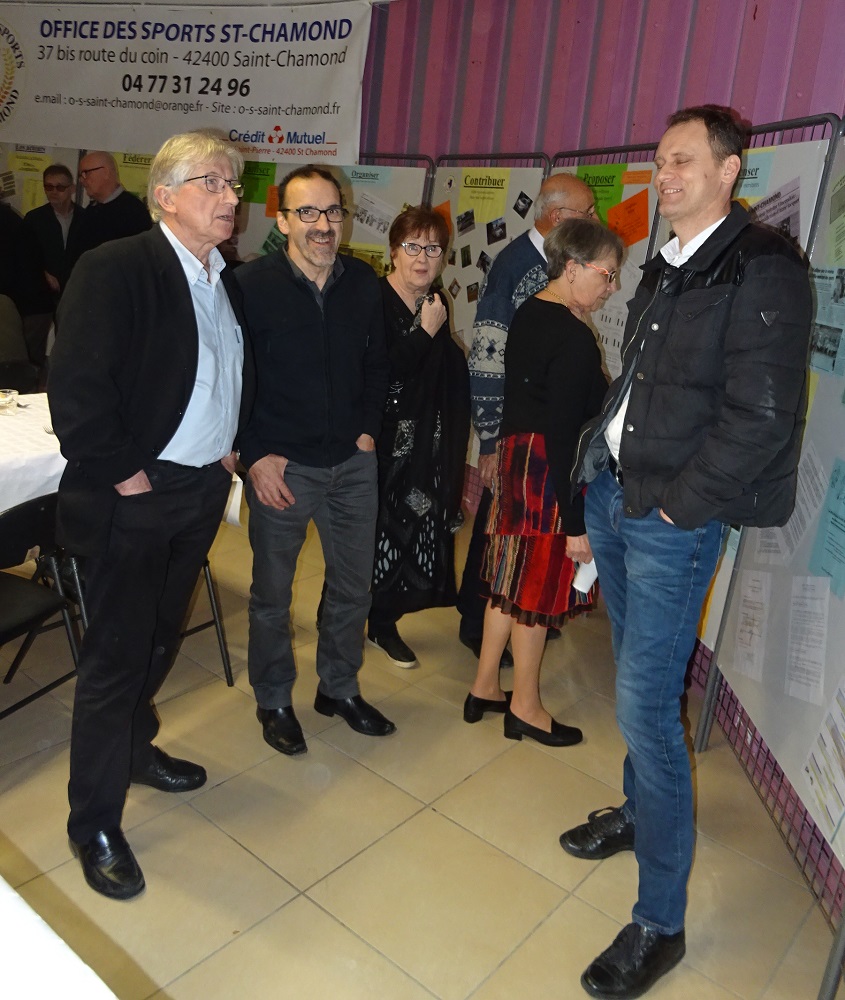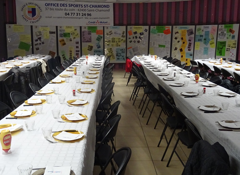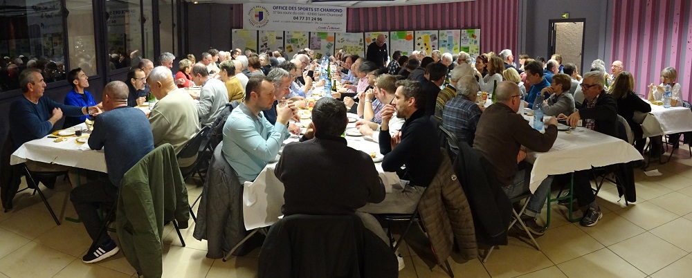 Vif succès pour notre rendez-vous annuel : en ce vendredi 9 mars 2018, la traditionnelle Choucroute des associations a rassemblé 130 personnes issues du monde sportif saint-chamonais. Dès 19h, dans la salle de restaurant du Centre Espace Pablo, ils étaient nombreux à se presser devant le buffet des apéritifs. Cette soirée était également l’occasion de présenter pour la première fois l’exposition qui commémore les 40 ans de notre Office des Sports. Déclinée sur 10 panneaux thématiques, cette présentation retrace la vie de notre Office et met en valeur son rôle et ses actions dans la vie sportive de notre ville. Le président Antoine Vincendon prenait la parole pour souhaiter la bienvenue aux représentants des clubs sportifs de Saint-Chamond ainsi qu’aux élus qui honoraient cette soirée de leur présence.